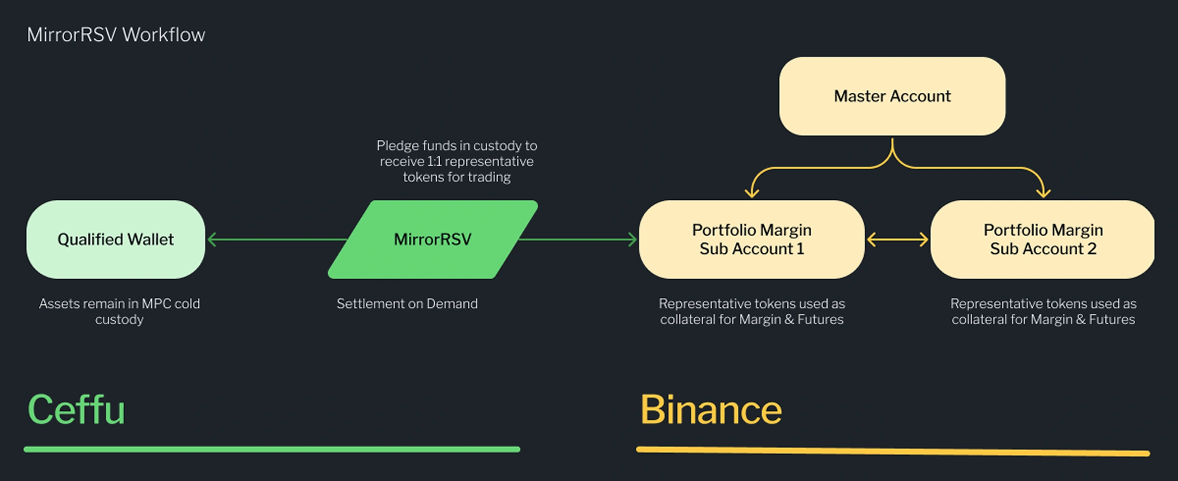 MirrorRSV is Ceffu's latest off-exchange settlement solution, developed in collaboration with Binance. It enables institutional clients to engage in margin and futures trading on Binance using representative assets, all while their original assets stay securely in Ceffu's MPC-backed cold storage.